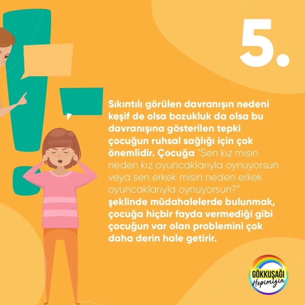 Sıkıntılı görülen davranışın nedeni keşif de olsa bozukluk da olsa bu davranışına gösterilen tepki çocuğun ruhsal sağlığı için çok önemlidir. Çocuğa ”Sen kız mısın neden kız oyuncaklarıyla oynuyorsun veya sen erkek misin neden erkek oyuncaklarıyla oynuyorsun?” şeklinde müdahalelerde bulunmak, çocuğa hiçbir fayda vermediği gibi çocuğun var olan problemini çok daha derin hale getirir.