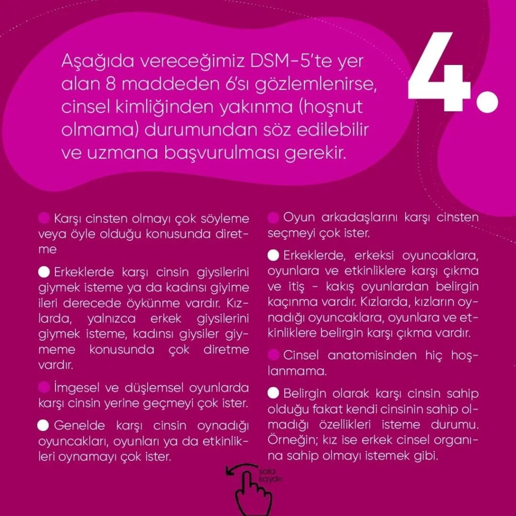 Aşağıda vereceğimiz DSM-5 ‘te yer alan 8 maddeden 6’sı gözlemlenirse, cinsel kimliğinden yakınma (hoşnut olmama) durumundan söz edilebilir ve uzmana başvurulması gerekir.