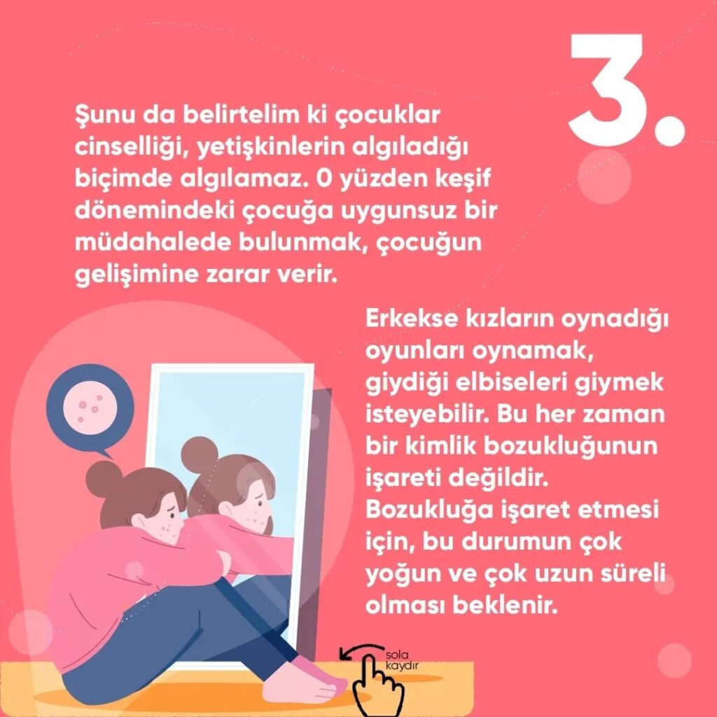 Şunu da belirtelim ki çocuklar cinselliği, yetişkinlerin algıladığı biçimde algılamaz. O yüzden keşif dönemindeki çocuğa uygunsuz bir müdahalede bulunmak, çocuğun gelişimine zarar verir. Erkekse kızların oynadığı oyunları oynamak, giydiği elbiseleri giymek isteyebilir. Bu her zaman bir kimlik bozukluğunun işareti değildir.