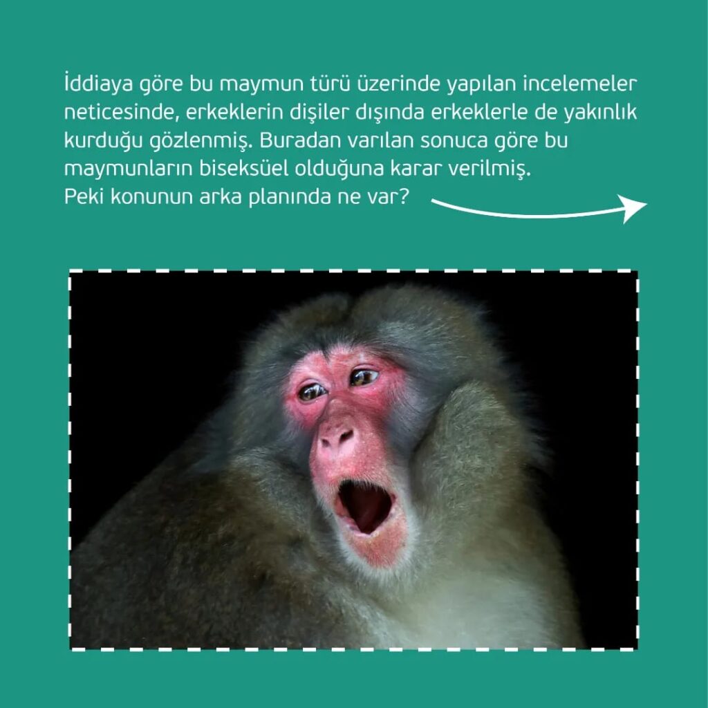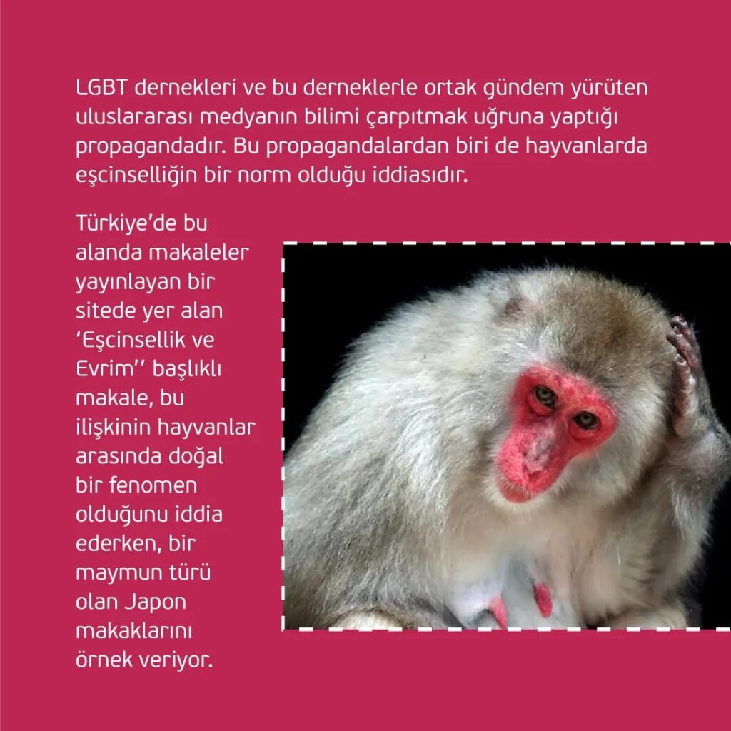 Türkiye’de bu alanda makaleler yayınlayan bir sitede yer alan ‘Eşcinsellik ve Evrim’’ başlıklı makale, bu ilişkinin hayvanlar arasında doğal bir fenomen olduğunu iddia ederken, bir maymun türü olan Japon makaklarını örnek veriyor.