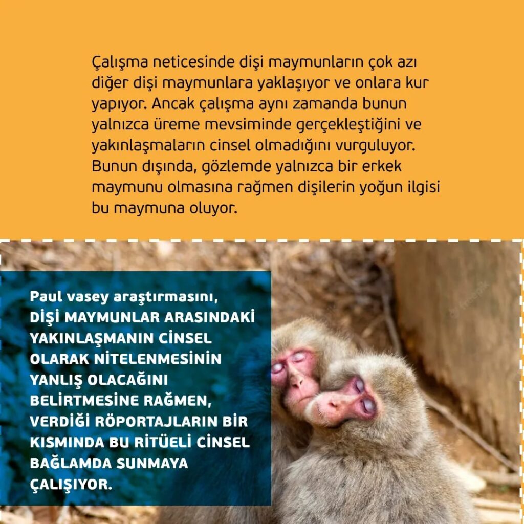 Paul vasey araştırmasını, DİŞİ MAYMUNLAR ARASINDAKİ YAKINLAŞMANIN CİNSEL OLARAK NİTELENMESİNİN YANLIŞ OLACAĞINI BELİRTMESİNE RAĞMEN, VERDİĞİ RÖPORTAJLARIN BİR KISMINDA BU RİTÜELİ CİNSEL BAĞLAMDA SUNMAYA ÇALIŞIYOR.