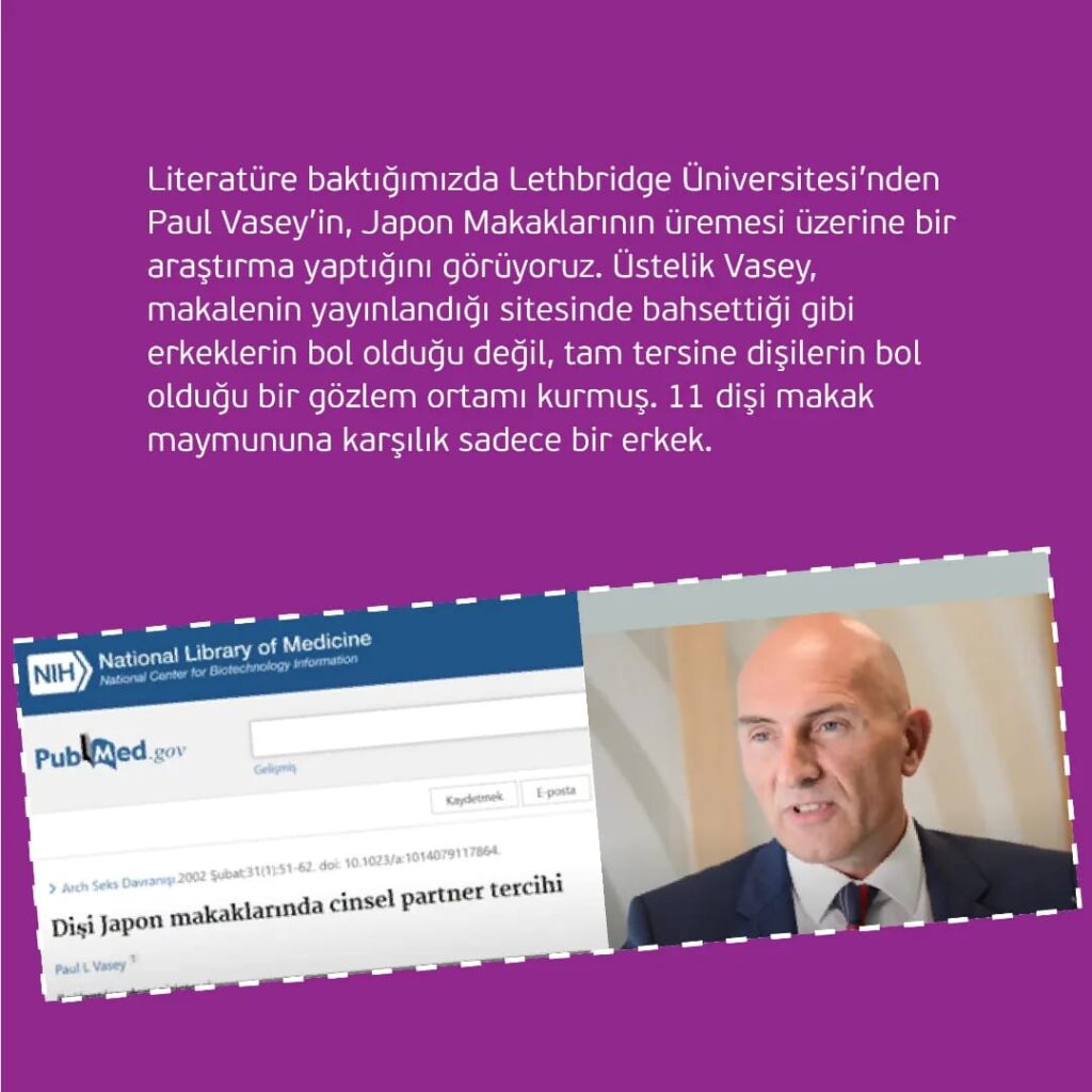 Literatüre baktığımız da Lethbridge Üniversitesi’nden Paul Vasey’in, Japon Makaklarının üremesi üzerine bir araştırma yaptığını görüyoruz. Üstelik Vasey, makalenin yayınlandığı sitesinde bahsettiği gibi erkeklerin bol olduğu değil, tam tersine dişilerin bol olduğu bir gözlem ortamı kurmuş. 11 dişi makak maymununa karşılık sadece bir erkek.