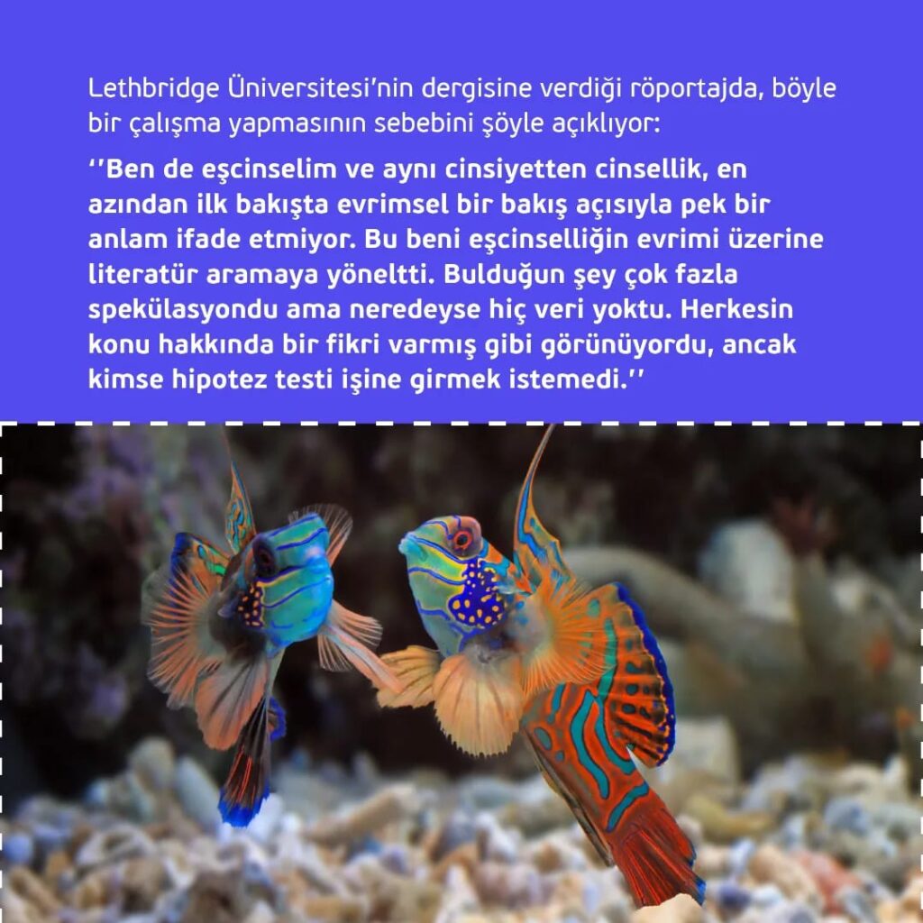 ‘’Bende eşcinselim ve aynı cinsiyetten cinsellik, en azından ilk bakışta evrimsel bir bakış açısıyla pek bir anlam ifade etmiyor. Bu beni eşcinselliğin evrimi üzerine literatür aramaya yöneltti. Bulduğun şey çok fazla spekülasyondu ama neredeyse hiç veri yoktu. Herkesin konu hakkında bir fikri varmış gibi görünüyordu, ancak kimse hipotez testi işine girmek istemedi.’’
