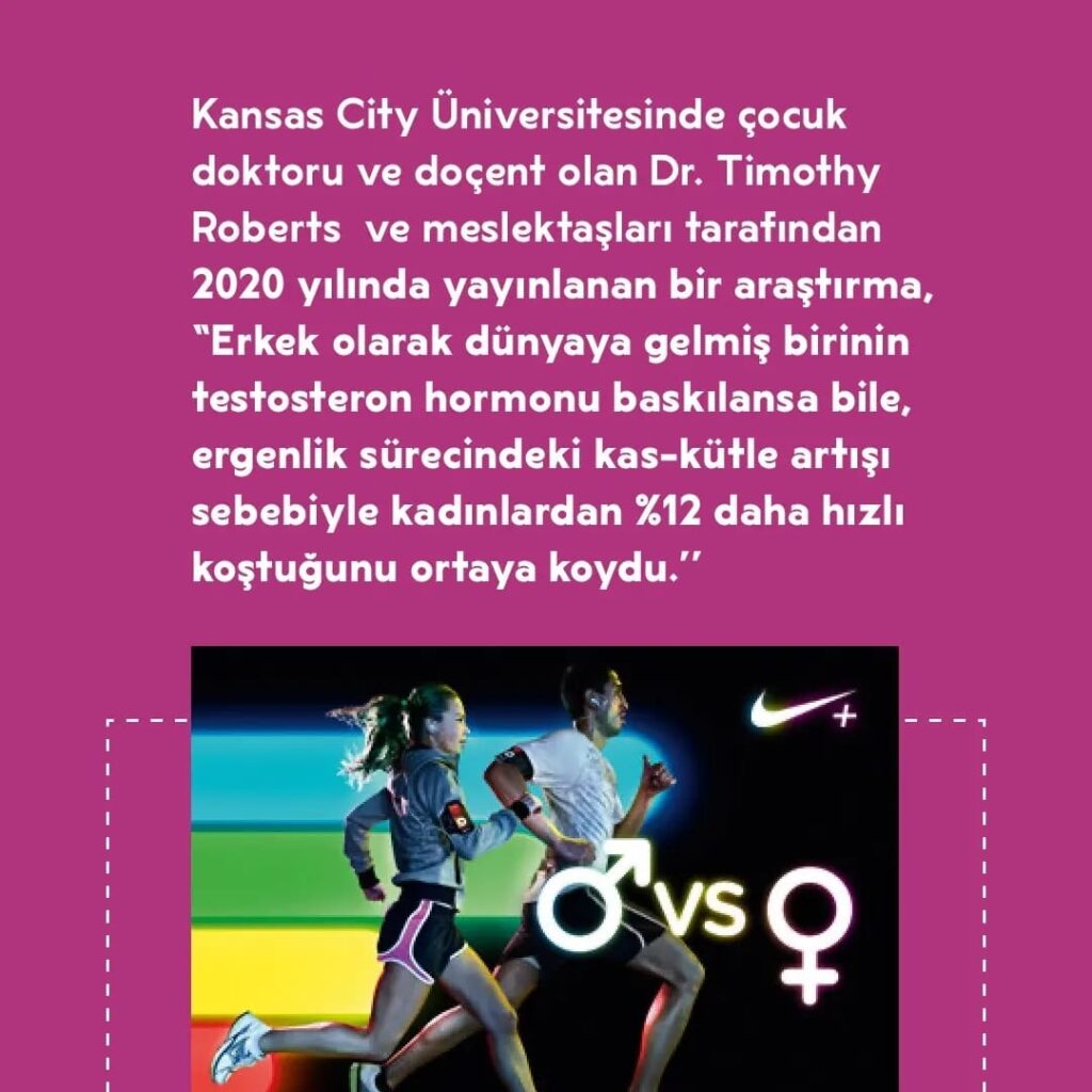 Kansas City Üniversitesinde çocuk doktoru ve doçent olan Dr. Timothy Roberts ve meslektaşları tarafından 2020 yılında yayınlanan bir araştırma, ‘’ Erkek olarak dünyaya gelmiş birinin testosteron hormonu baskılansa bile, ergenlik sürecindeki kas-kütle artışı sebebiyle kadınlardan %12 daha hızlı koştuğunu ortaya koydu.’’