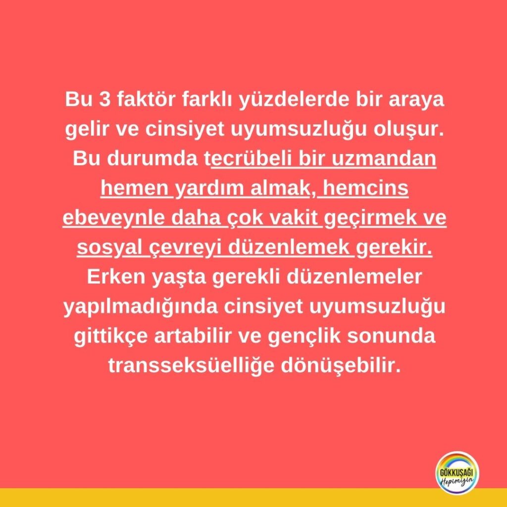 Bu 3 faktör farklı yüzdelerde bir araya gelir ve cinsiyet uyumsuzluğu oluşur. Bu durumda tecrübeli bir uzmandan hemen yardım almak, hemcins ebeveynle daha çok vakit geçirmek ve sosyal çevreyi düzenlemek gerekir.
