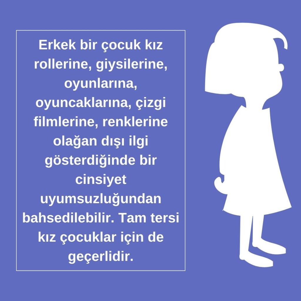 Erkek bir çocuk kız rollerine, giysilerine, oyunlarına, oyuncaklarına, çizgi filmlerine, renklerine olağan dışı ilgi gösterdiğinde bir cinsiyet uyumsuzluğundan bahsedilebilir. Tam tersi kız çocuklar için de geçerlidir.