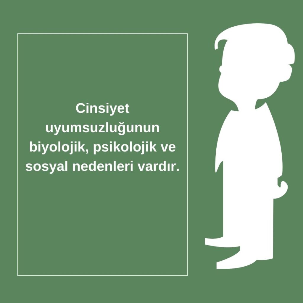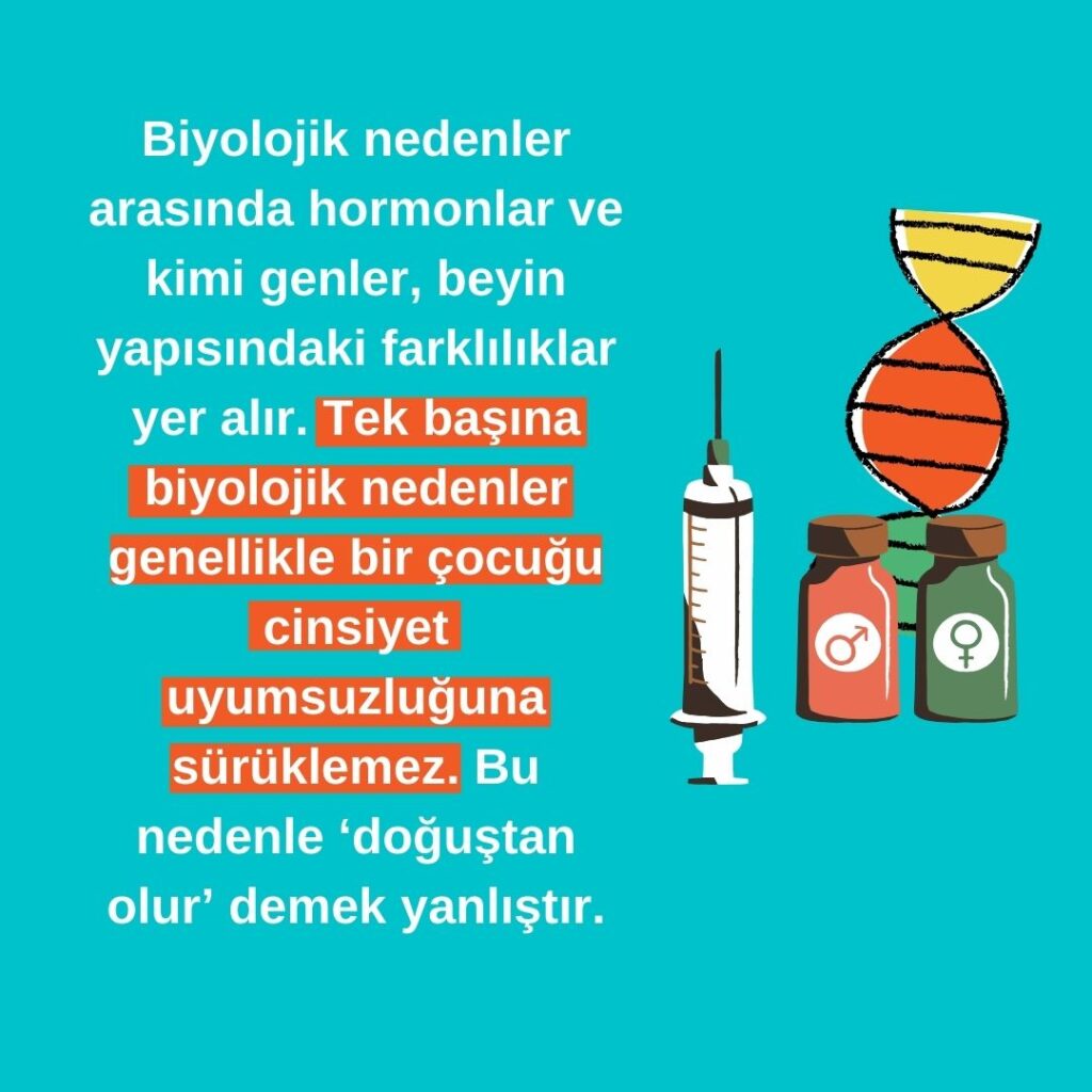 Biyolojik nedenler arasında hormonlar ve kimi genler, beyin yapısındaki farklılıklar yer alır. Tek başına biyolojik nedenler genellikle bir çocuğu cinsiyet uyumsuzluğuna sürüklemez. Bu nedenle ‘doğuştan olur’ demek yanlıştır.