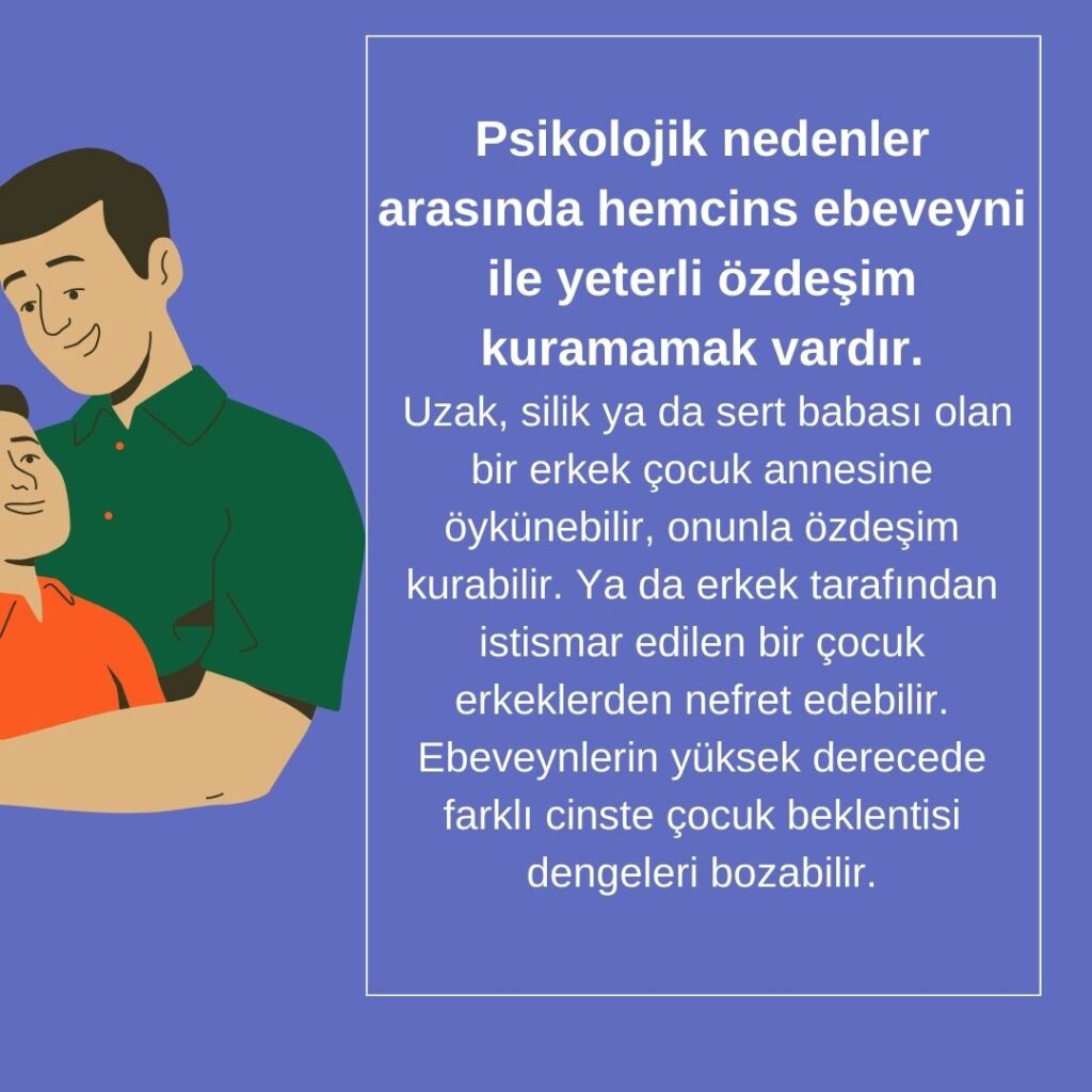 Psikolojik nedenler arasında hemcins ebeveyni ile yeterli özdeşim kuramamak vardır. Uzak, silik ya da sert babası olan bir erkek çocuk annesine öykünebilir, onunla özdeşim kurabilir. Ya da erkek tarafından istismar edilen bir çocuk erkeklerden nefret edebilir. Ebeveynlerin yüksek derecede farklı cinste çocuk beklentisi dengeleri bozabilir.