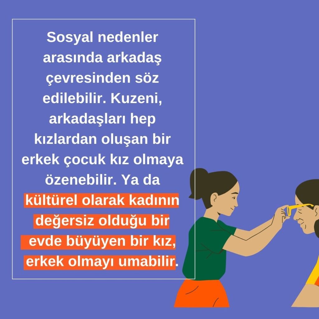 Sosyal nedenler arasında arkadaş çevresinden söz edilebilir. Kuzeni, arkadaşları hep kızlardan oluşan bir erkek çocuk kızlığına özenebilir. Ya da kültürel olarak kadının değersiz olduğu bir evde büyüyen bir kız, erkek olmayı umabilir.