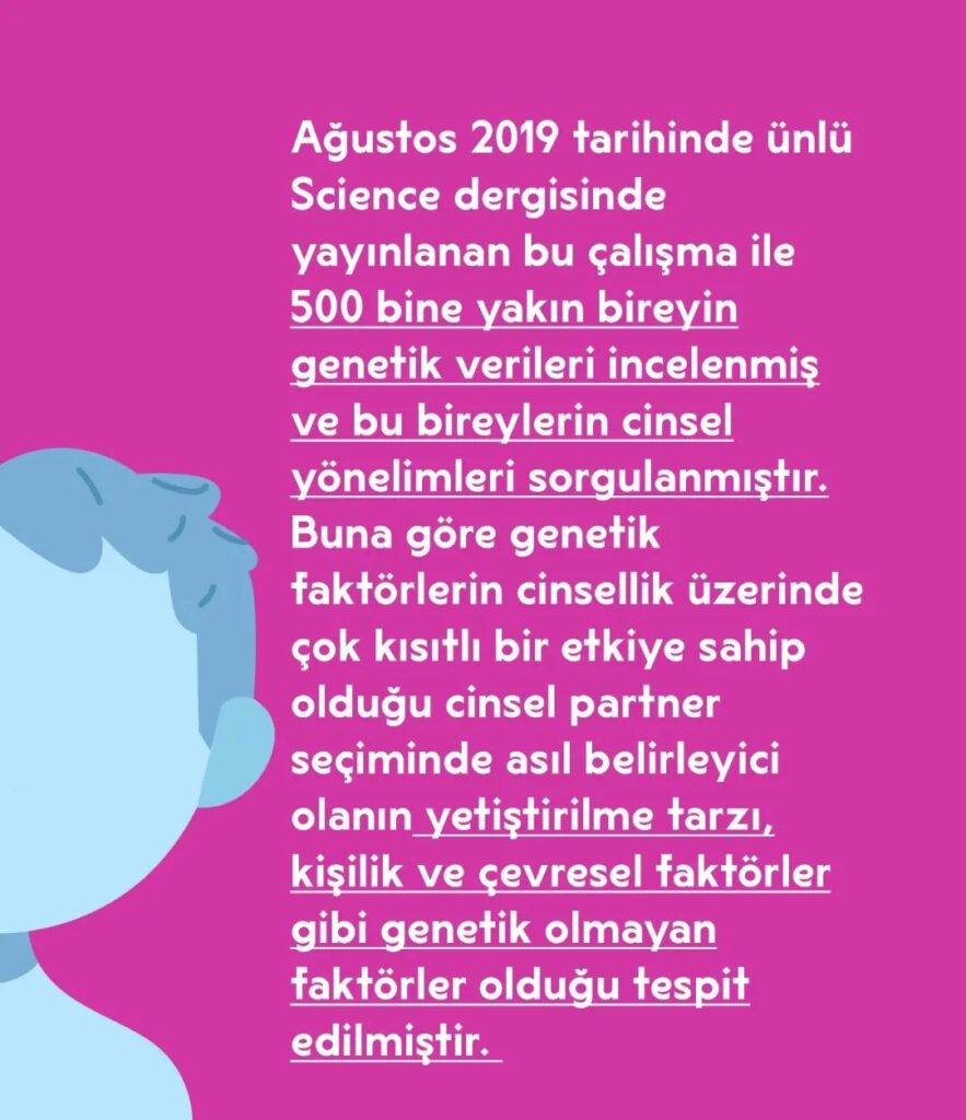 Ağustos 2019 tarihinde ünlü Science dergisinde yayınlanan bu çalışma ile 500 bine yakın bireyin genetik verileri incelenmiş ve bu bireylerin cinsel yönelimleri sorgulanmıştır. Buna göre genetik faktörlerin cinsellik üzerinde çok kısıtlı bir etkiye sahip olduğu cinsel partner seçiminde asıl belirleyici olanın yetiştirilme tarzı, kişilik ve çevresel faktörler gibi genetik olmayan faktörler olduğu tespit edilmiştir.