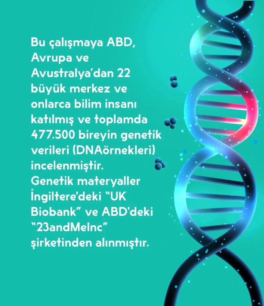 Bu çalışmaya ABD, Avrupa ve Avustralya’dan 22 büyük merkez ve onlarca bilim insanı katılmış ve toplamda 477.500 bireyin genetik verileri (DNA örnekleri) incelenmiştir. Genetik materyaller İngiltere’deki “UK Biobank” ve ABD’deki “23andMeInc” şirketinden alınmıştır.