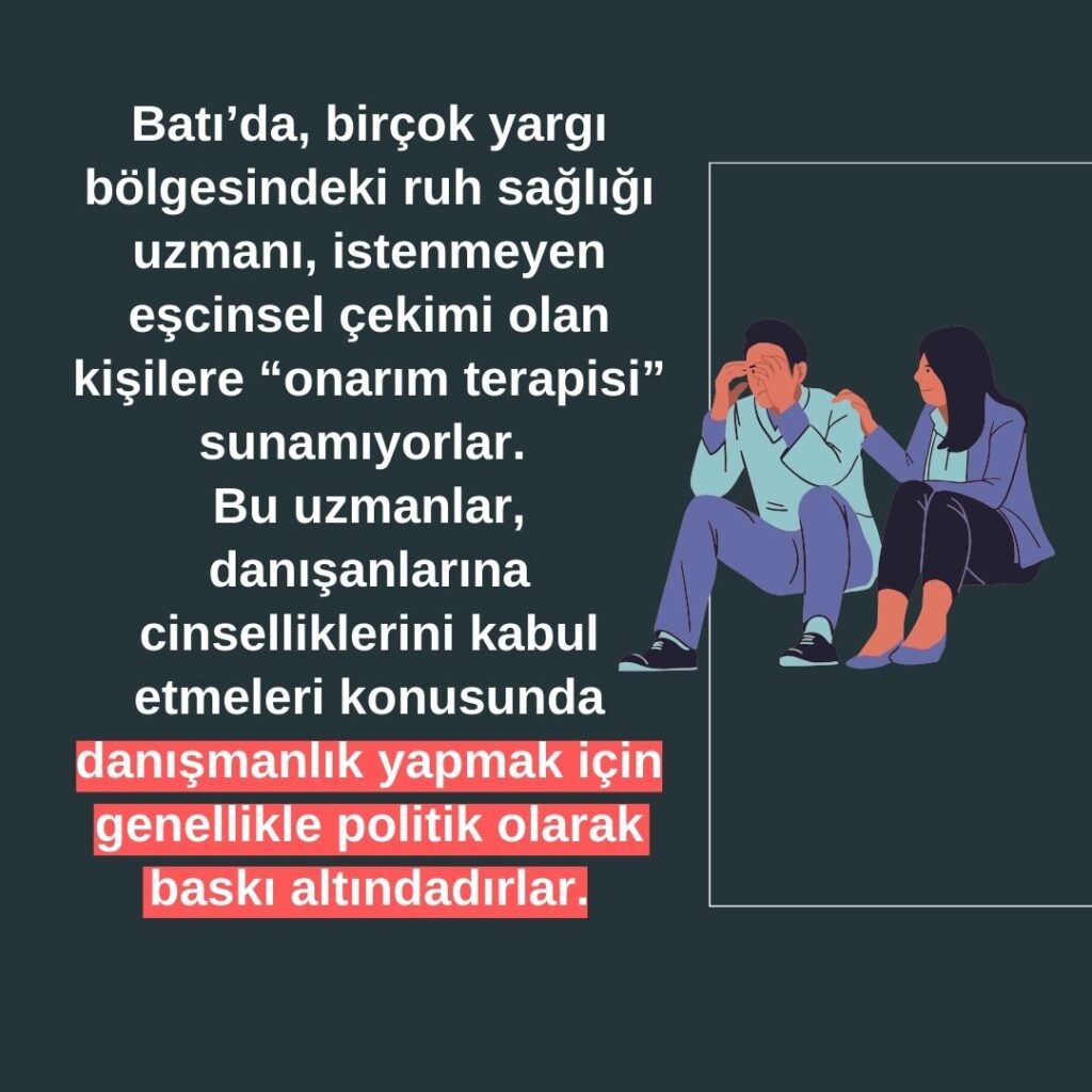 Batı’da, birçok yargı bölgesindeki ruh sağlığı uzmanı, istenmeyen eşcinsel çekimi olan kişilere “onarım terapisi” sunamıyorlar.