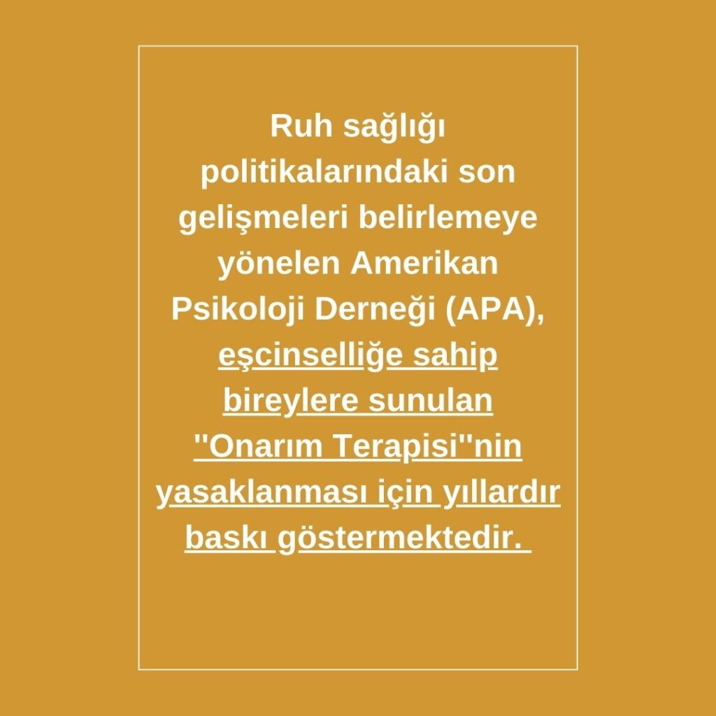 Ruh sağlığı politikalarındaki son gelişmeleri belirlemeye yönelen Amerikan Psikoloji Derneği (APA), eşcinselliğe sahip bireylere sunulan Onarım terapisinin yasaklanması için yıllardır baskı göstermektedir.