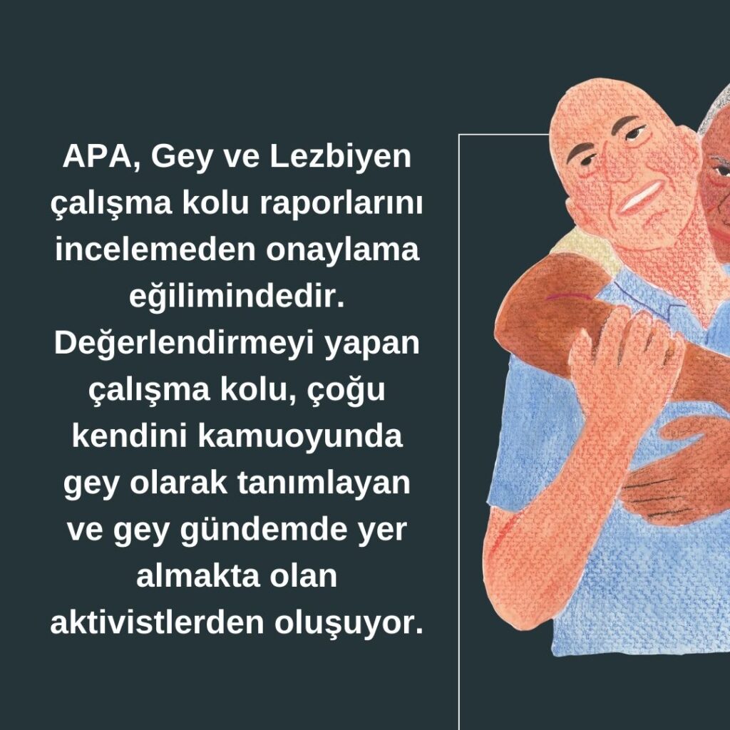 APA, Gey ve Lezbiyen Çalışma Kolu raporlarını incelemeden onaylama eğilimindedir. Değerlendirmeyi yapan Çalışma Kolu, çoğu kendini kamuoyunda gey olarak tanımlayan ve gey gündemde yer almakta olan aktivitelerden oluşuyor.