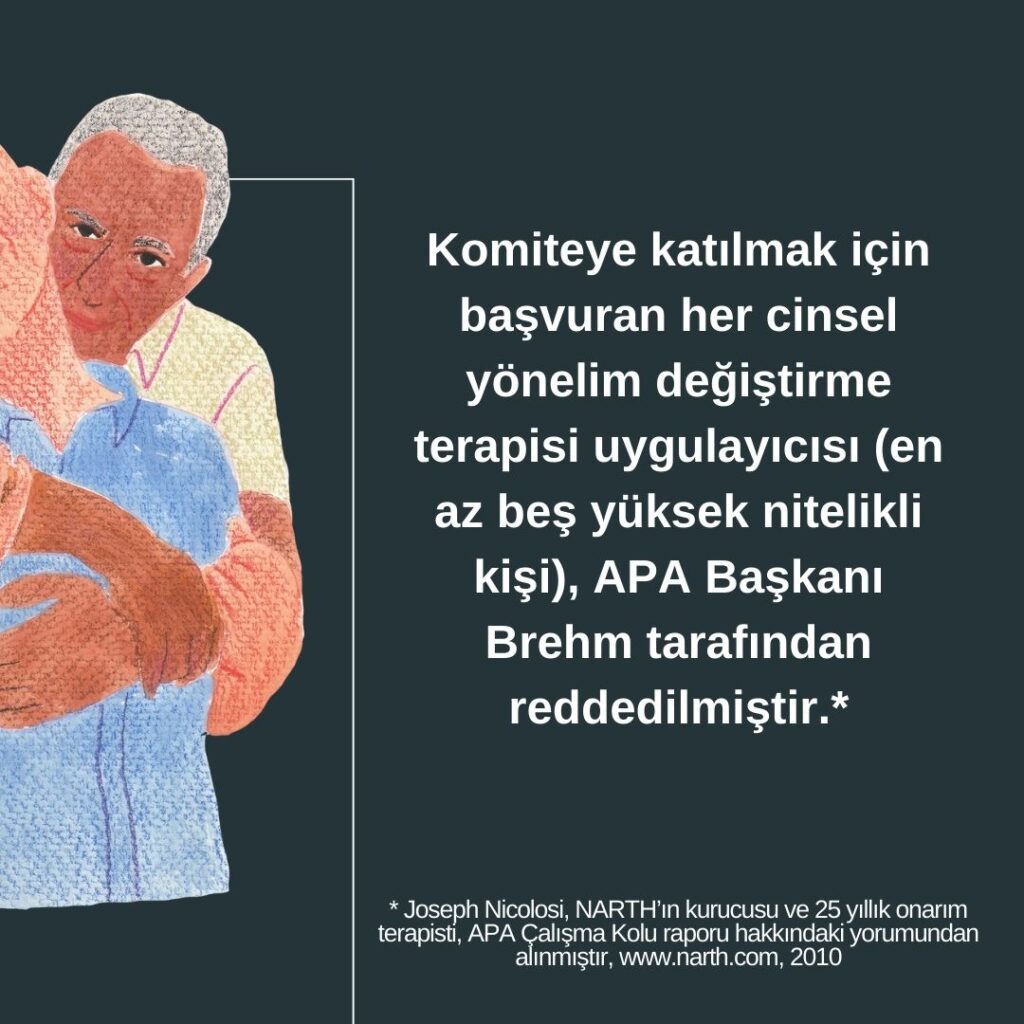 * Joseph Nicolosi, NARTH’ın kurucusu ve 25 yıllık onarım terapisti, APA Çalışma Kolu raporu hakkındaki yorumundan alınmıştır, www.narth.com, 2010