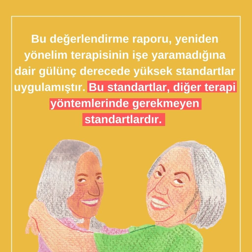 Bu değerlendirme raporu, yeniden yönelim terapisinin işe yaramadığına dair gülünç derecede yüksek standartlar uygulamıştır. Bu standartlar, diğer terapi yöntemlerinde gerekmeyen standartlardır.