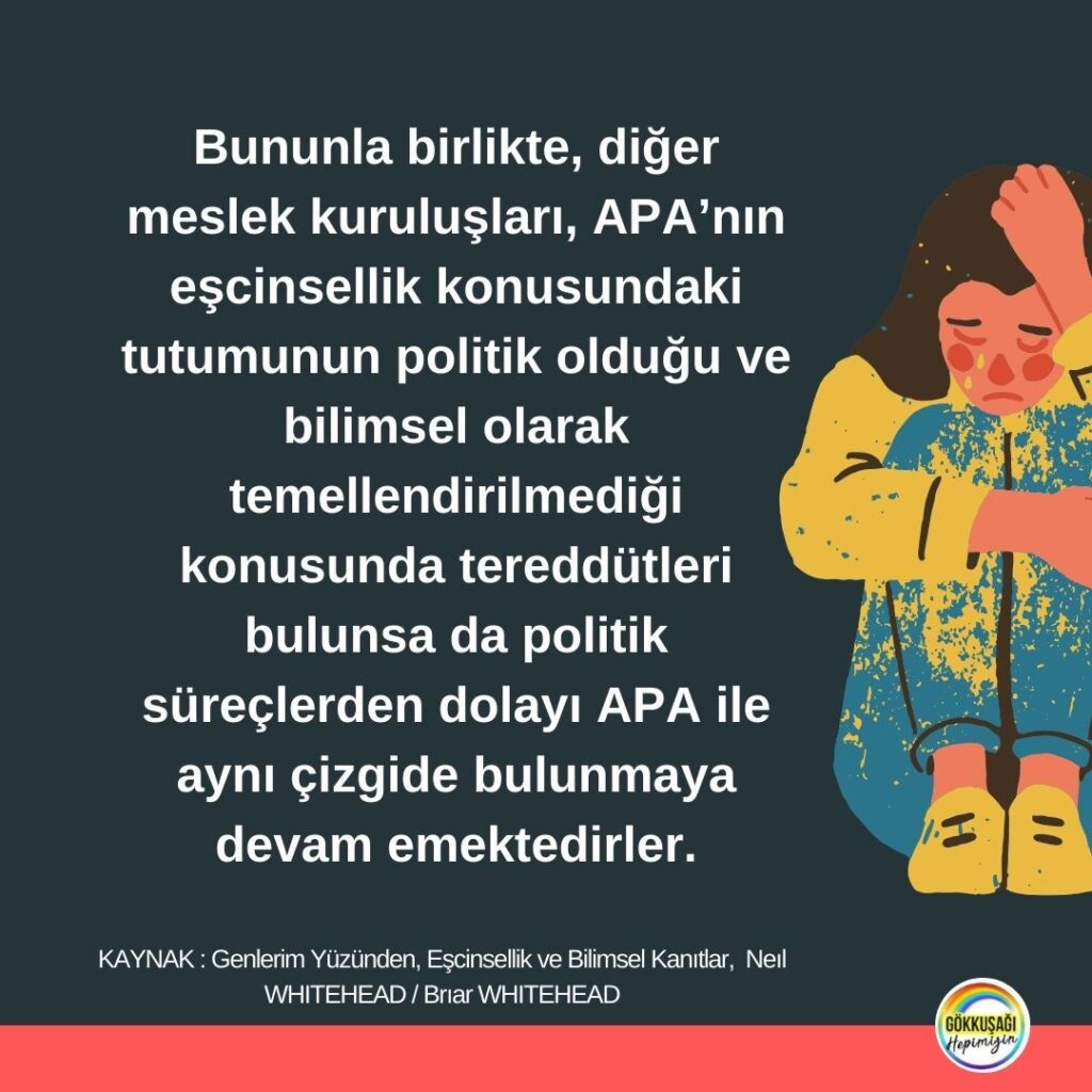 Bununla birlikte, diğer meslek kuruluşları, APA’nın eşcinsellik konusundaki tutumunun politik olduğu ve bilimsel olarak temellendirilmediği konusunda, tereddütleri bulunsa da politik süreçlerden dolayı APA ile aynı çizgide bulunmaya devam emektedirler.